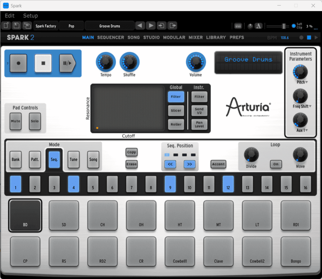 Yukarıdaki Arturia Spark LE cihazı görülmektedir. Bu cihaz tek başına çalışmaz. Cihazı kullanabilmek için Spark 2 adı verilen yazılımı kurmanız ve bu yazılımı kullanmanız gerekir. Yazılımı kullanabilmek için bu cihazı bir bilgisayara USB kablosu ile bağlamalısınız. Yazılım bu cihaza özel üretildiği için cihazı otomatik olarak tanır ve tuşları ve düğmelerini kullanabilmenizi sağlar. Bu yazılım isterseniz tek başına ya da bir Müzik Yazılımı (DAW) içinde Sanal Enstrüman Eklentisi (Virtual Instrument Plugin) olarak kullanılabilir. Yazılımın görüntüsü aşağıdaki gibidir :